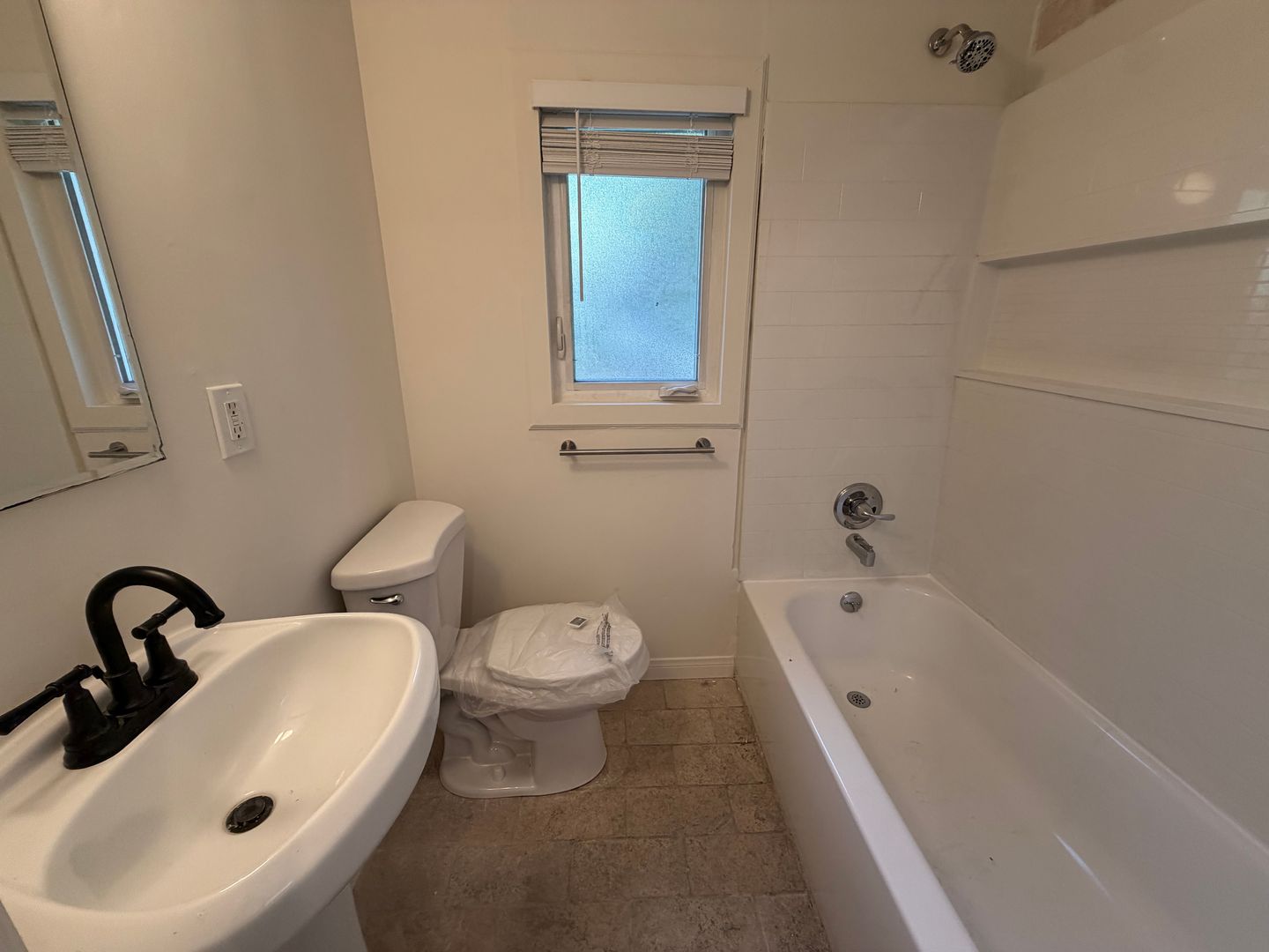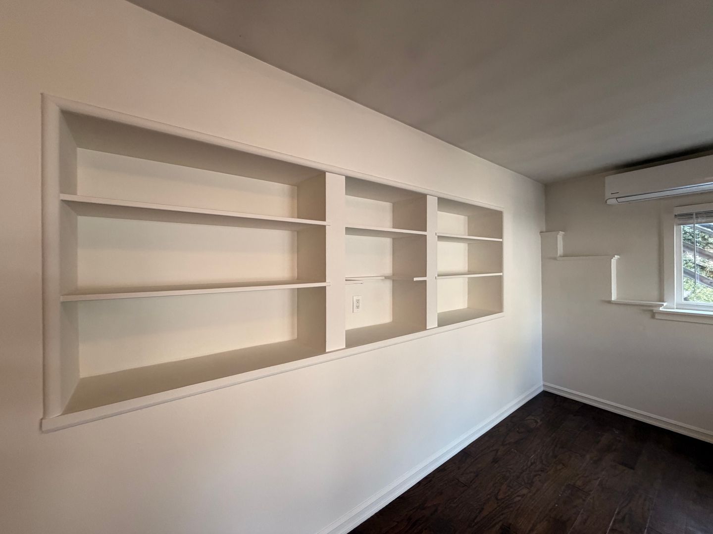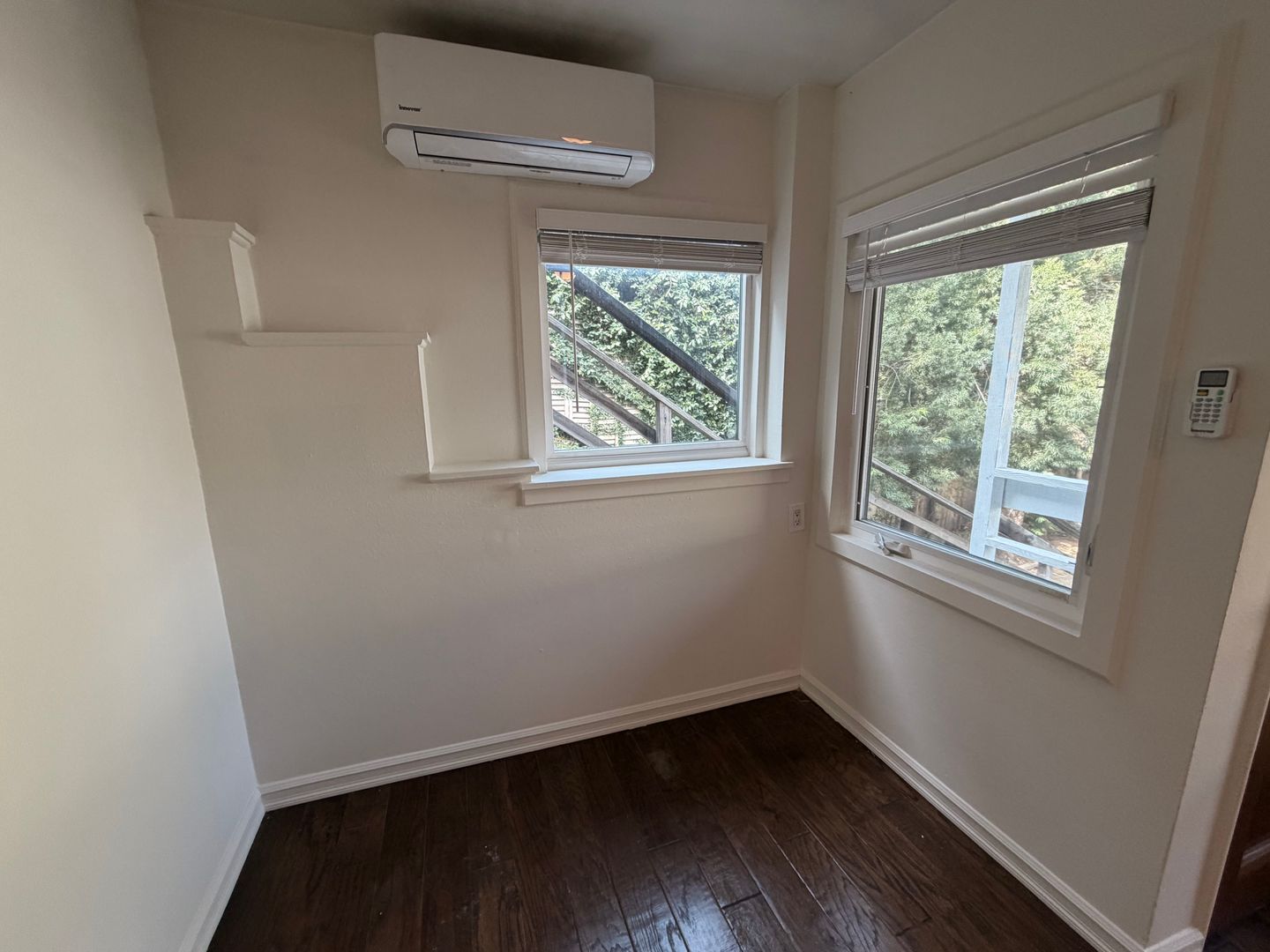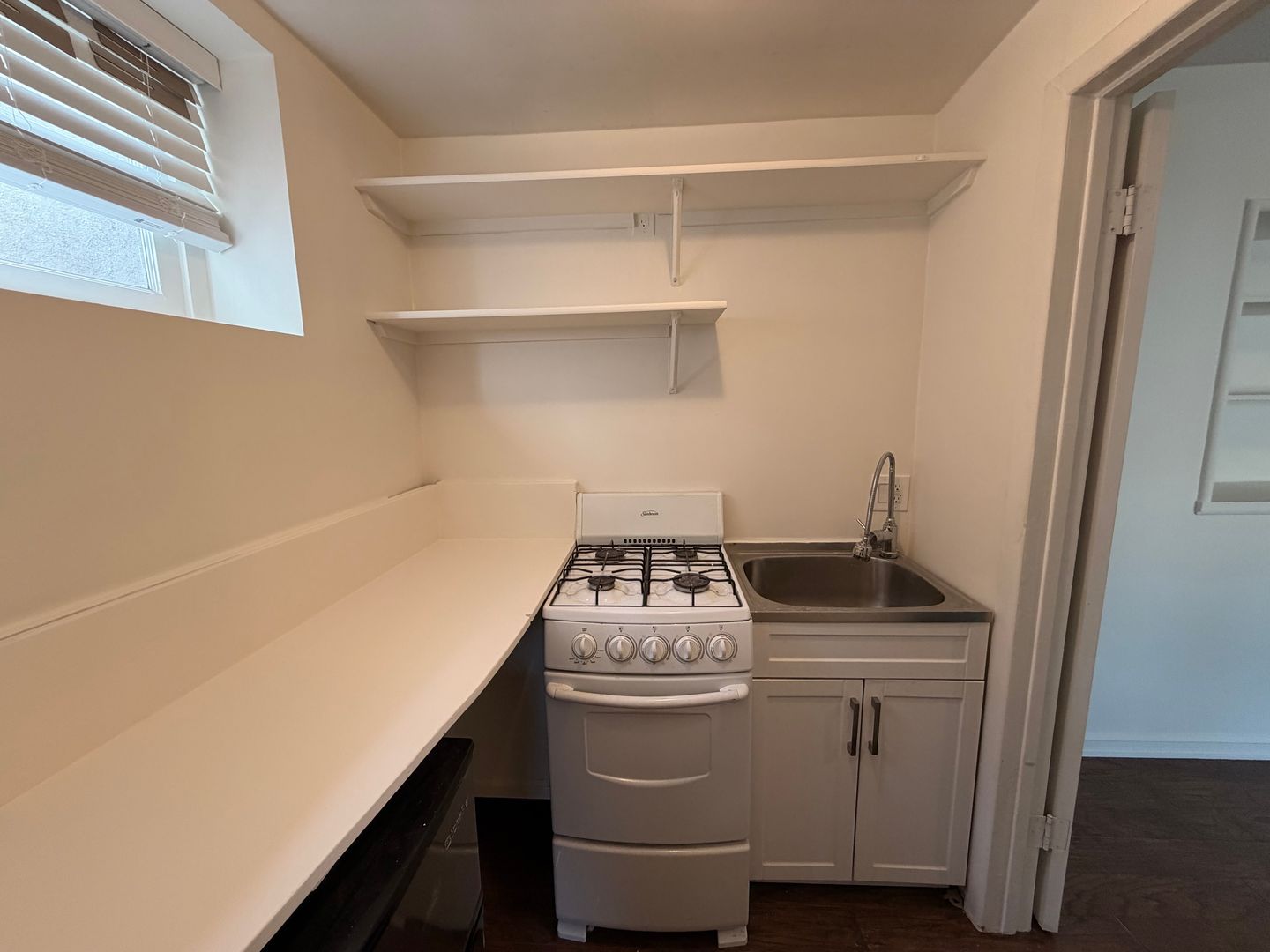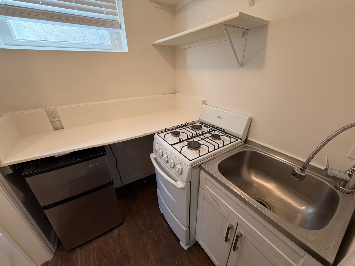 The studio features freshly painted walls that brighten the space and give the home a clean, refreshed feel. The kitchen is equipped with a stove and mini refrigerator for everyday cooking. The unit also includes original hardwood flooring, adding warmth and vintage charm throughout. A wall A/C unit helps keep the space cool, and the bathroom offers a full shower-tub combo.