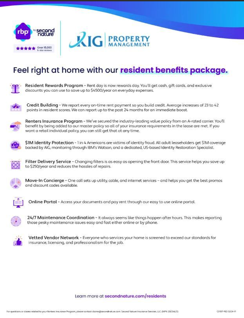 All KIG Property Management residents are invited to enroll in the Resident Benefits Package (RBP) for $46.95/month which includes liability insurance, credit building to help boost the resident’s credit score with timely rent payments, up to $1M Identity Theft Protection, HVAC air filter delivery (for applicable properties), move-in concierge service making utility connection and home service setup a breeze during your move-in, our best-in-class resident rewards program and much more! More details upon application.