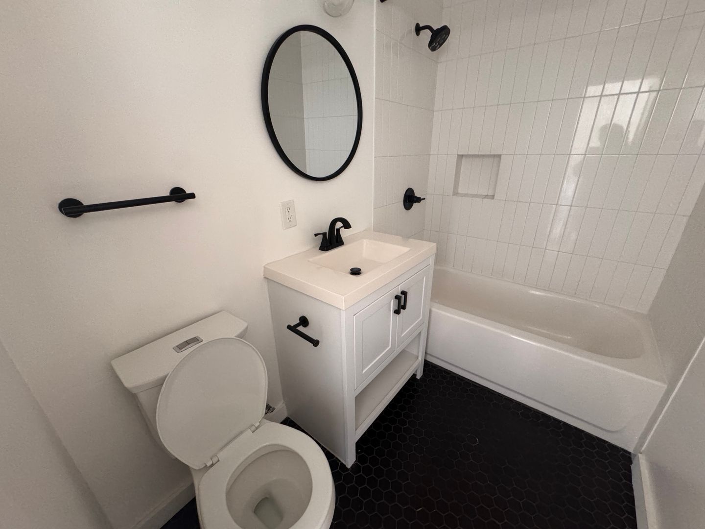 The bathroom sits in the middle and is uber-stylish. Features like matte black fixtures, subway tile, and custom tile flooring make our heart swoon. Bonus: the unit comes with an AC unit and a communal courtyard.