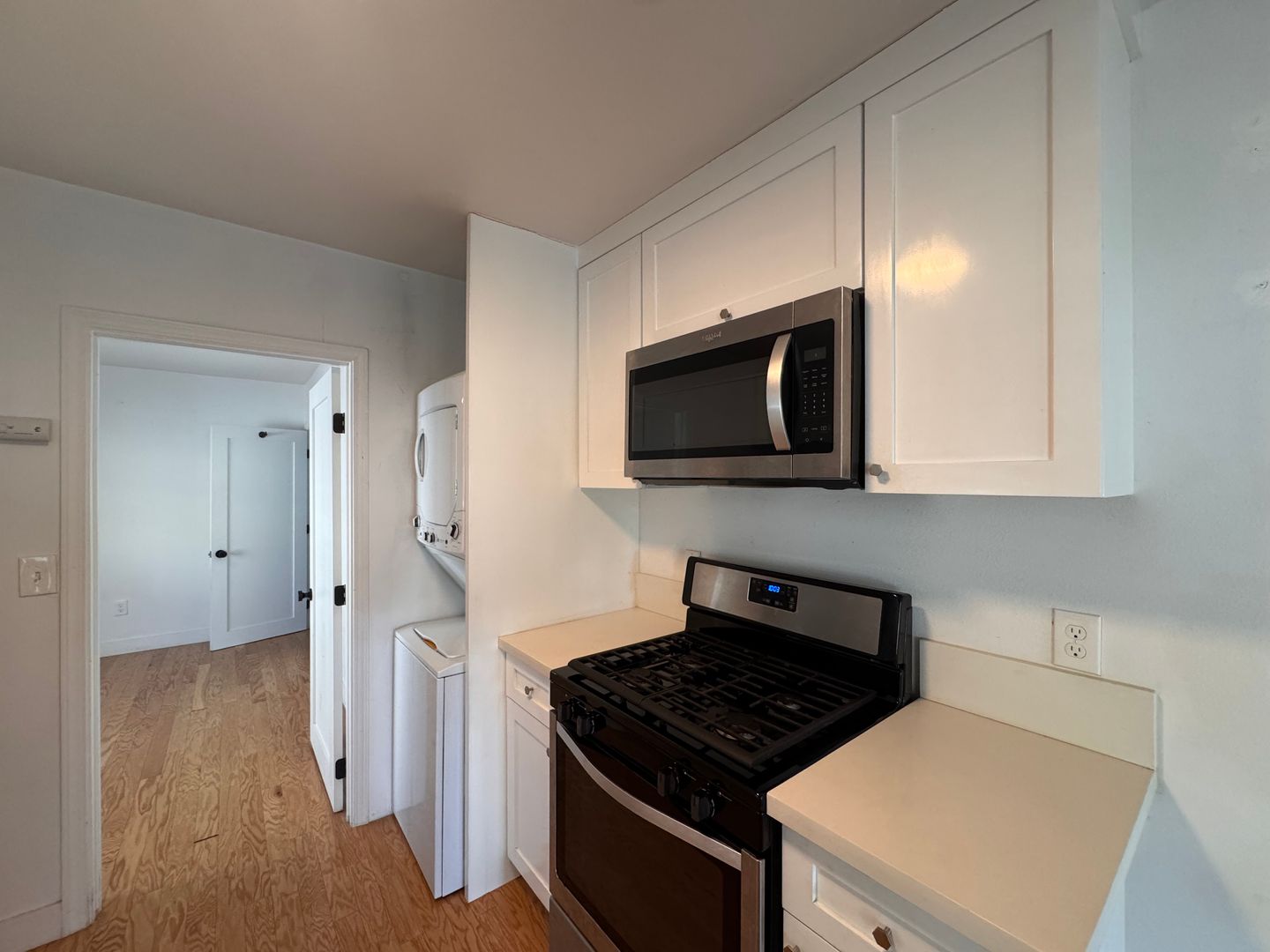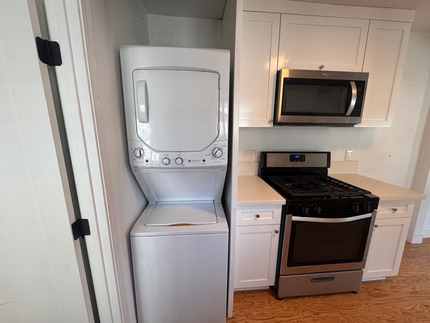 This inviting unit offers a comfortable living experience with features designed for everyday convenience, including an in-unit washer and dryer, a well-equipped kitchen with essential appliances, hardwood floors, and a generously sized bedroom and bathroom featuring a classic tiled shower and deep soaking tub. The home is filled with great natural lighting throughout, enhanced by beautiful French doors that open to a private patio.