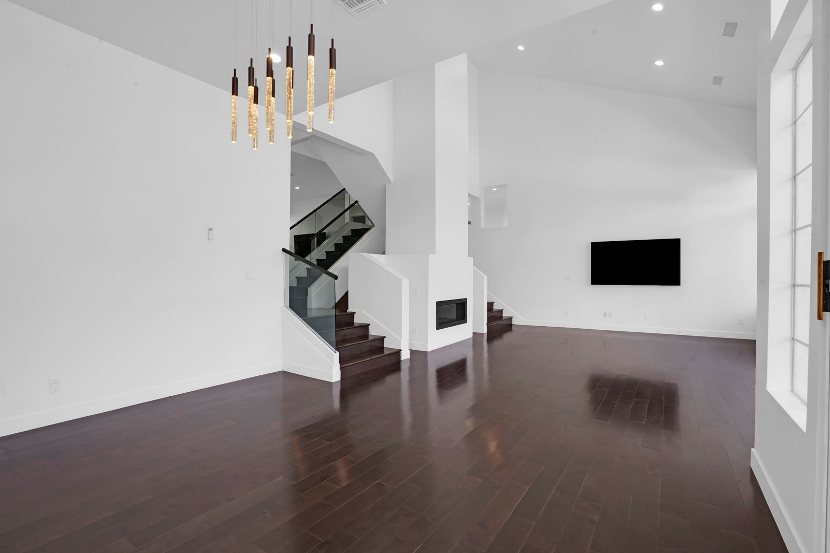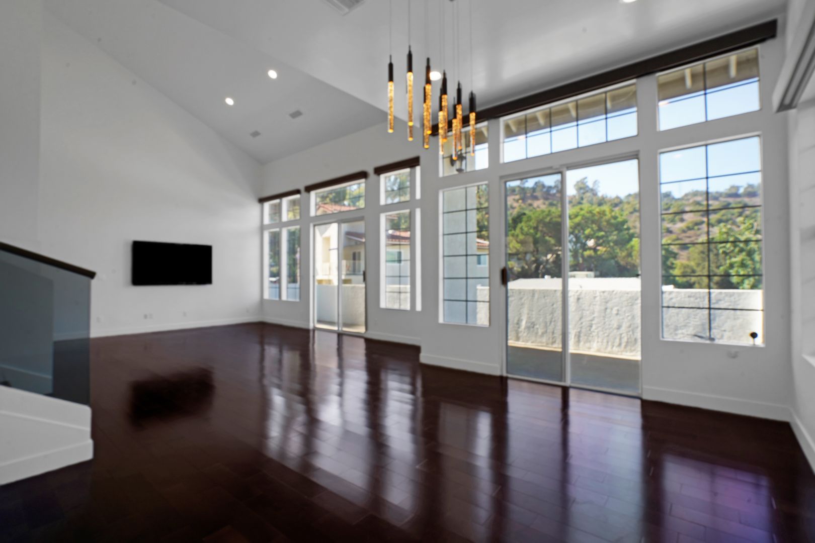 The main living areas boast tall ceilings, beautiful hardwood floors, and an airy, open feel. Cozy up by the gas fireplace, or control the home’s smart technology with ease—from lighting to the two home theaters, each decked out with wall-mounted TVs and built-in speakers. Natural light floods every corner, creating a bright yet cool environment, especially with the automated shades.